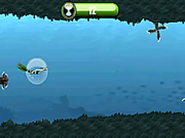 Управляй монстром ben10 в водном мире, избегай столкновений с баррикадами. Он не может стрелять или пинать их, может лишь плавать вверх и вниз, иначе он потеряет жизнь.