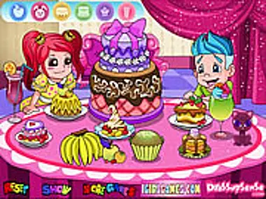 Сегодня будет восхитительный ужин со множеством тортов, фруктов и сладких напитков, и эти двое детей так счастливы. Подари им самый лучший сладкий ужин, украшая торт и расставляя на столе все вкусные торты и фрукты.