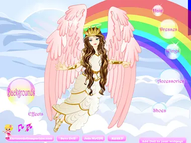 Beautiful Marietta is an angel who lives up in the sky in a peaceful magic world. She is a good angel who brings peace and harmony on the Earth and gives good children sweet dreams at night. Play with beautiful Marietta by changing her angelic look the way you want. Dress her up with the dress you like best, choose a pair of wings for her, the shoes you want and some pretty accessories. You can also change the magic background! Enjoy!