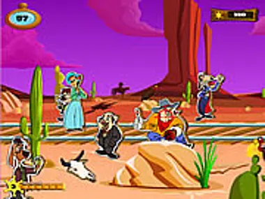 hit the bad guys with your cork-shooter to clear them out of town. Avoid the good guys - if you hit one you will lose time.